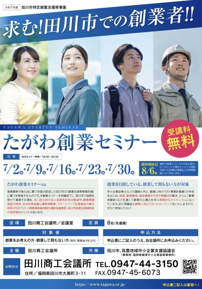 田川市が開催している創業セミナーはありませんが、連携団体である田川商工会議所が「たがわ創業セミナー」を実施しています。