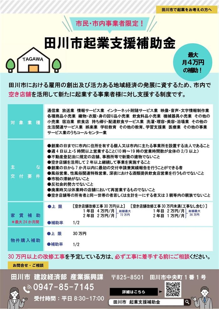 引用:田川市起業支援補助金 ~空き店舗を活用して起業する方を支援します!~|田川市