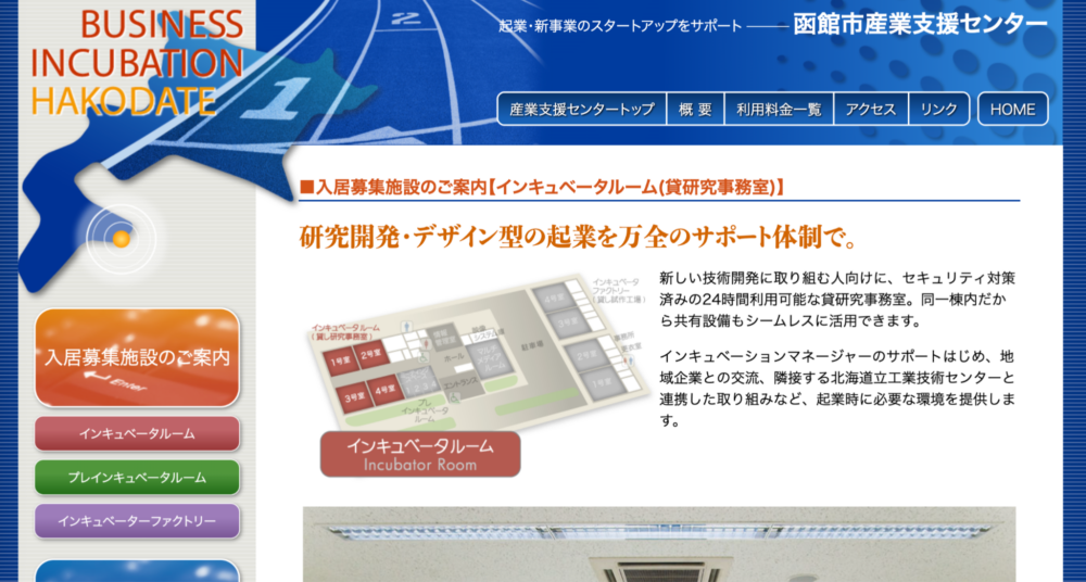 出典:入居募集施設のご案内【インキュベータルーム(貸研究事務室)】|函館地域産業振興財団(函館市産業支援センター)