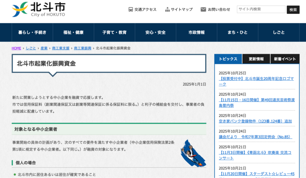 | 斡旋融資・創業融資 | ◯ | 北斗市で行っている斡旋融資はありませんが、創業融資に「北斗市起業化振興資金」があります。 |