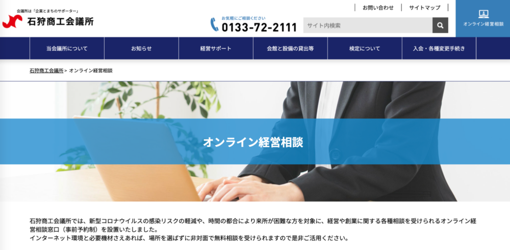 石狩商工会議所では、経営や創業に関する各種相談を受けられるオンライン経営相談窓口(事前予約制)を設置しました。