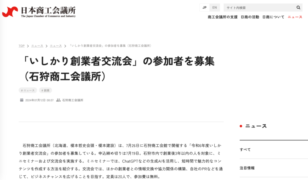 出典:「いしかり創業者交流会」の参加者を募集|日本商工会議所