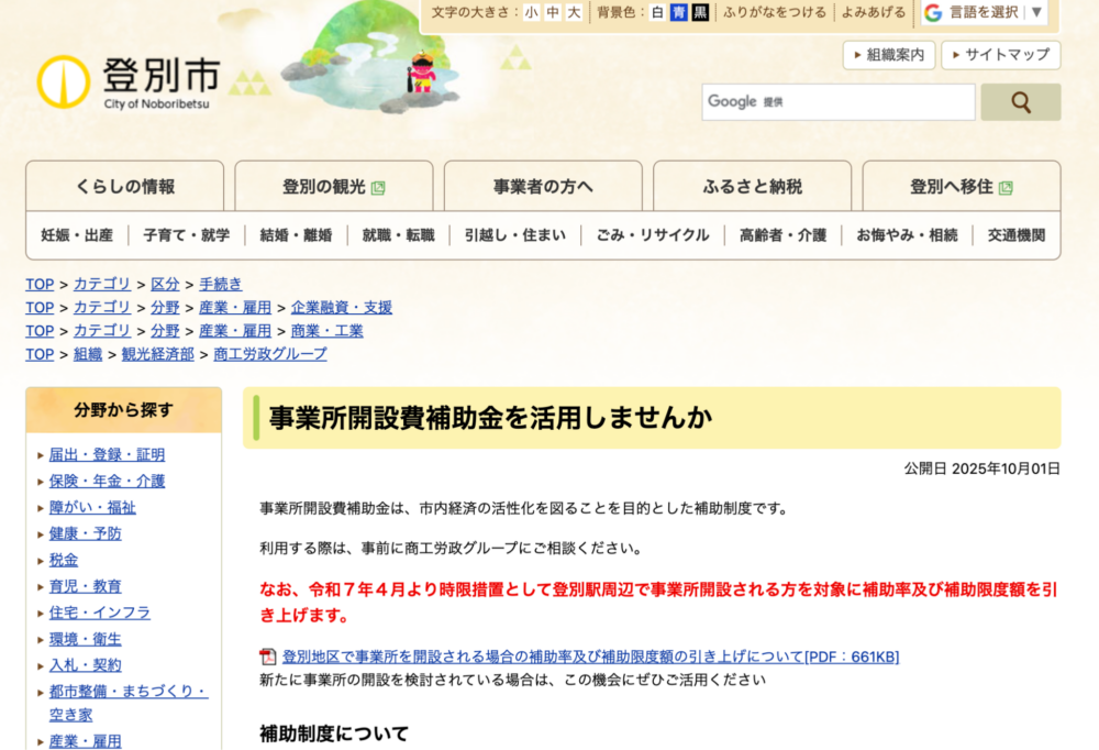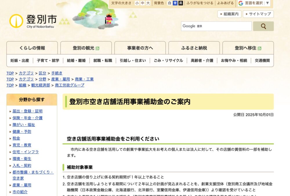 補助金・助成金 | ◯ | 登別市で行っている補助金・助成金に「事業所開設費補助金」「登別市空き店舗活用事業補助金」があります。 |