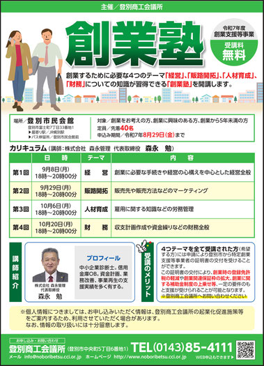 登別市には認定特定創業支援事業があり支援等事業計画に基づいて実施しています。