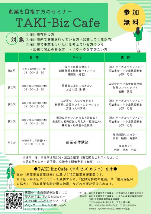 「TAKI-Biz Cafe」については北海道滝川市の創業セミナー・起業塾「TAKI-Biz Cafe(滝川市産業活性化協議会)」をご確認ください