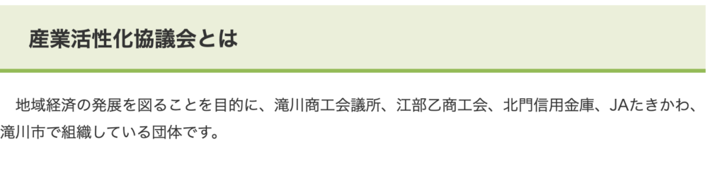 参考:滝川市について|滝川市観光サイトENJOY!TAKIKAWA 第3期滝川市まち・ひと・しごと創生総合戦略|まち・ひと・しごと創生|滝川市 産業創造支援事業補助金|滝川市 滝川市産業活性化協議会 TAKI-Biz Cafeを開催いたします|滝川市 滝川市産業活性化協議会 TAKI-Biz Cafe 2nd (タキビズカフェ セカンド)を開催いたします|滝川市