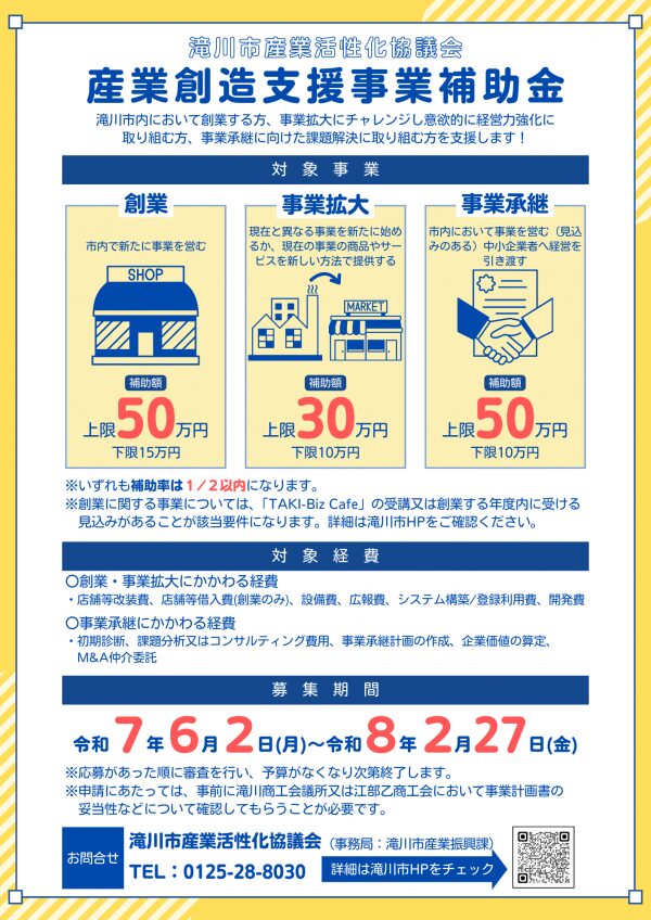 補助対象者 | 補助対象者は次のいずれにも該当する方となります。 【創業・事業拡大に関わる事業】 (1)滝川市内において創業する中小企業者又は事業を営む中小企業者。 (2)滝川商工会議所又は江部乙商工会から事業計画の確認を受けた者。 (3)滝川商工会議所若しくは江部乙商工会の会員である者又は申請を行う日の属する年度に会員となる者。 (4)中小企業基本法第2条第1項に規定する中小企業者。 (5)滝川市税の滞納がない者。 (6)代表者、役員又は使用人その他の従業員若しくは構成員等が、滝川市暴力団の排除の推進に関する条例(平成26年滝川市条例第12号第2条第1号)に規定する暴力団、同条第2号に規定する暴力団員又は同条第4号に規定する暴力団関係事業者に該当又は関与していない者。 (7)滝川市競争入札参加資格者指名停止事務処理要領(平成11年滝川市告示第43号)第2条第1項又は第3条第1項から第3項までの規定による指名競争入札に関する指名を停止されていない者。 (8)申請を行う年度内に、滝川市産業活性化協議会産業創造支援事業補助金の交付決定を受けていない者。 【事業承継に関わる事業】 (1)滝川市内において事業を営む中小企業者。 (2)下記に定める支援機関の支援を受けている者。 支援機関:滝川商工会議所、江部乙商工会、北海道事業承継・引継ぎ支援センター (3)上記【創業・事業拡大に関わる事業】の(4)~(8)に該当する者。 |