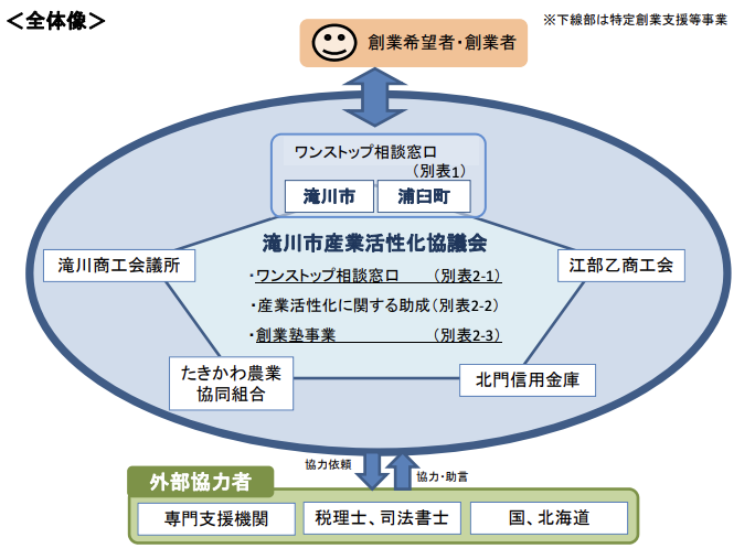 滝川市には認定特定創業支援事業があり支援等事業計画に基づいて実施しています。