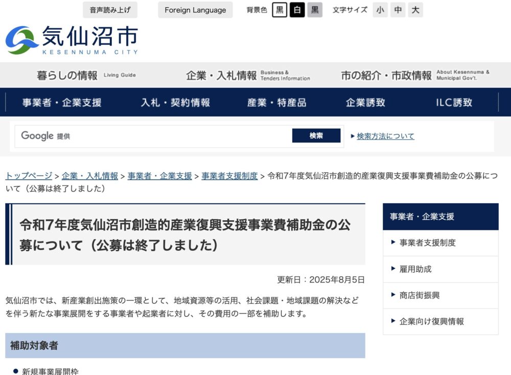 | 補助金・助成金 | ◯ | 気仙沼市の補助金・助成金には「気仙沼市創造的産業復興支援事業費補助金」があります。 |
