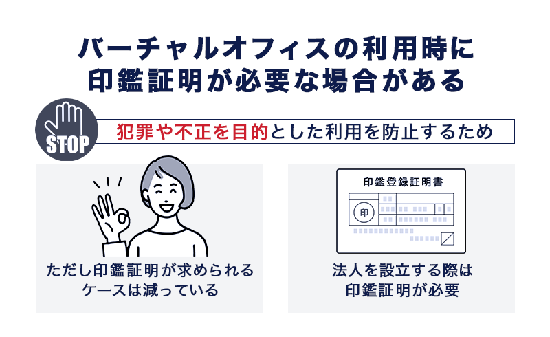 法人を設立する際は、発起人や取締役の印鑑証明が必要です。バーチャルオフィスとの契約では不要であっても、法人を設立するときには印鑑証明を準備しておく必要があります。